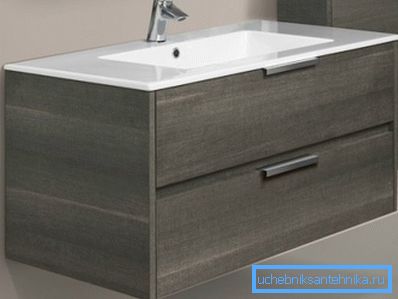 - Muebles realizados en aglomerado chapeado. La opción de presupuesto, pero incluso el tratamiento con barnices impermeables, no siempre salva de las deformaciones y deslaminaciones. Para tal compra debe ser cauteloso. El sistema sobre patas es deseable, sin contacto con un piso, el producto servirá por mucho más tiempo.