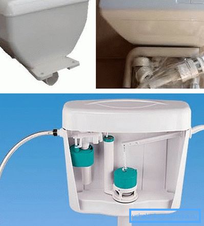 | En el lado | Cuando la válvula inferior, por alguna razón, no le conviene, puede instalar el lado izquierdo o derecho. El agua también se puede traer con una manguera flexible. Los lugares que deben cortarse con un cuchillo están marcados en el tanque. Tenga en cuenta que no siempre es posible que la solapa lateral se incluya en el kit y que se compre por separado. |