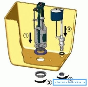 Prácticamente todos los tanques de drenaje fabricados en la actualidad tienen una válvula de flotador que regula el suministro de agua, un botón de descarga, accesorios de drenaje y una tapa. Estructuralmente, esta lista puede cambiar, pero los componentes principales y el principio de funcionamiento seguirán siendo los mismos (consulte también el artículo Qué hacer si el agua corre en el inodoro: cómo reparar el tanque y no drenar el dinero en la alcantarilla).