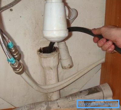 Consejo: a veces, el tradicional sifón en el baño se reemplaza por un tubo rígido curvado con una compuerta de agua. En este caso, es mejor colocar el cable directamente desde el baño, y el efecto y la calidad de la limpieza aumentarán muchas veces si abre agua caliente simultáneamente.
