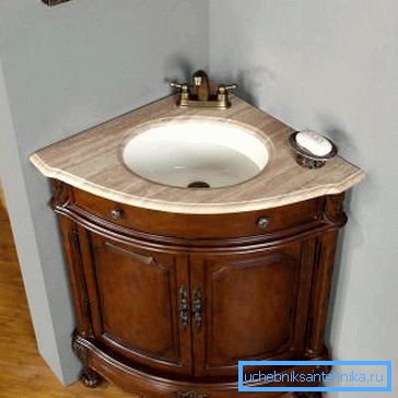 El fregadero de esquina para el baño con un cajón con patas es una opción intermedia que se puede instalar en cualquier habitación. No se requieren habilidades especiales de instalación en absoluto. De hecho, es un mueble independiente que es suficiente para colocarlo en un rincón, como un armario normal de tamaños más pequeños.