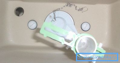 Luego inserte el mecanismo de botón en el soporte en la válvula de drenaje de la cisterna del inodoro en la parte inferior. Le colocamos una cadena en uno de los varios orificios del yugo, no debe estirarlo: