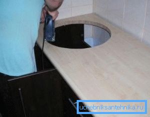 - Estrictamente en el patrón en varios pases cortar un agujero. Intentamos evitar posibles irregularidades. Incluso el error más pequeño puede llevar al hecho de que los bordes del fregadero no se ajustarán perfectamente a la superficie de la mesa, así que tenga mucho cuidado en esta etapa.