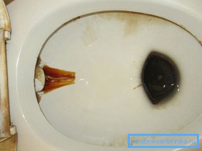 - A menudo los inquilinos observan un tinte amarillento o marrón de agua del grifo. Esto es escala, partículas de óxido de la superficie interna de las comunicaciones. Casi siempre el color cambia después de las reparaciones o el reemplazo de tuberías en la casa o en la tubería vertical. Después de varios sofocos, una pátina oxidada aparecerá inmediatamente en el inodoro.