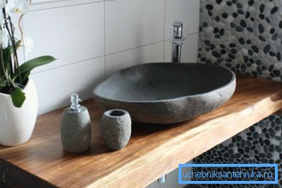 - Las conchas de piedra a menudo se cortan de una variedad de mármol natural o granito, y luego se someten a molienda húmeda y pulido. Las principales ventajas de estos productos son que están hechos de material natural respetuoso con el medio ambiente, tienen una resistencia muy alta, además de tener un aspecto caro y noble. La principal desventaja es el alto costo del lavabo para el baño, así como un peso bastante grande.