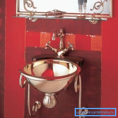 - La plomería metálica es menos común, en su mayoría productos hechos de metales no ferrosos, cobre y bronce.. Tienen una superficie perfectamente lisa, lo que no siempre es conveniente, en esta superficie se pueden ver todos los rasguños y manchas. Además, estos tazones son bastante ruidosos, si el vidrio, la cerámica o la piedra suprimen el sonido de la caída de agua, el metal, por el contrario, se fortalece.