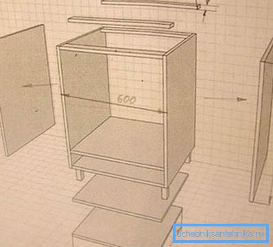 - Haga una caja sin mesa, instalando accesorios para estantes, las puertas también cuelgan de las bisagras o las reemplazan con cajones. En este último caso, debe tener en cuenta que las comunicaciones de ingeniería se llevarán a cabo dentro del bolardo. Recomendamos permanecer en los estantes.
