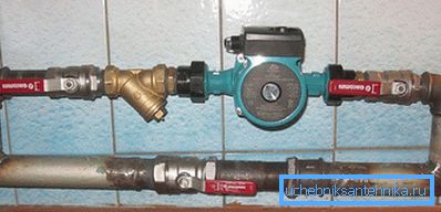 - Para la comodidad del servicio del dispositivo, las válvulas se instalan delante y detrás de él, y la bomba está montada en conexiones plegables. Si es necesario, puede retirarse sin drenar el agua del sistema de calefacción. Antes de la bomba después de la válvula, se instala un filtro grueso para retrasar la escala, la arena y otros residuos insolubles (especialmente importante si los radiadores son viejos y las tuberías son metálicas). También es necesario llevar electricidad al sitio de instalación de la bomba.