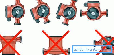 - Dado que la mayoría de las bombas de circulación domésticas funcionan solo con un sistema de calefacción lleno de agua (simplemente se queman sin agua), deben instalarse horizontal o verticalmente, observando la dirección del movimiento del agua (indicada por la flecha en el cuerpo), el rotor debe colocarse horizontalmente. Si la bomba se encuentra en una posición diferente cuando hay fugas de agua, su parte eléctrica puede estar inundada, o habrá un nivel de agua insuficiente en el interior y el dispositivo se quemará.