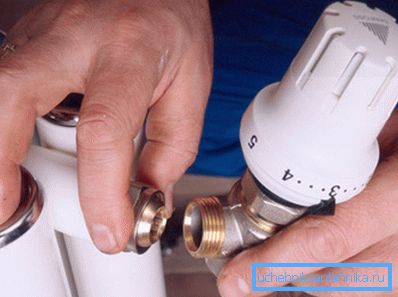 - A continuación, en la entrada y salida de los adaptadores de batería se instalan, a los que se llevan las tuberías. En algunos casos, una válvula de control se atornilla en la entrada. Todas las conexiones roscadas deben ser herméticas, para esto deben sellarse con una cinta de humo o hilos de lino y un sellador resistente al calor. Como regla general, las válvulas de bola se instalan antes y después de la salida, así como también se realiza una derivación. Este método de atado le permite bloquear el flujo de refrigerante en la batería sin desconectar el sistema de calefacción, lo que puede ser necesario por varias razones.