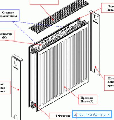 El dispositivo es muy simple: a partir de dos láminas de acero, al presionar, los espacios en blanco se extraen, se interconectan y se sueldan; en el interior, se obtiene un sistema de canales a través del cual circula el refrigerante. Para mejorar la transferencia de calor y mejorar la convección, muchos modelos tienen una parrilla en forma de U en el interior, y los extremos laterales y superiores están cerrados con elementos decorativos.
