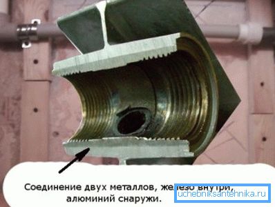 Todos los radiadores bimetálicos de calefacción doméstica están hechos de dos tipos diferentes de metal y, en la mayoría de los casos, son un circuito compuesto en el que los colectores internos del tronco y los canales de conducción de calor verticales están hechos de acero, y la cubierta exterior y el aleteo lateral están hechos de metales no ferrosos con alta conductividad térmica.