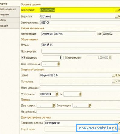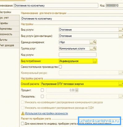 Ahora debemos especificar con nuestras propias manos lo que se calculará, como Calentamiento por medidor, donde se utilizarán las indicaciones del TLI o del dispositivo de medición individual. Aquí debe especificar el tipo de consumo Individual, al calcular de acuerdo con las lecturas del medidor.