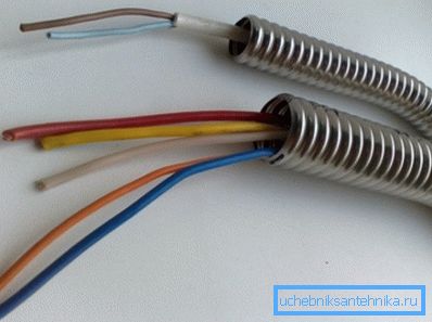 - Usando el broche, colocamos los cables en las tuberías, llevando los extremos a las cajas de conexiones y podozetniki.