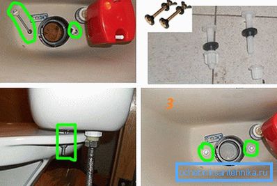 Después de eso es importante prestar atención a los agujeros dentro de la cisterna. Deben coincidir totalmente con los orificios que están en el estante del inodoro. Sujetan los pernos de montaje, que en ambos lados deben tener una junta. Utilice la llave para tuercas para apretar con cuidado las tuercas. En el proceso de montaje de los pernos, no olvide colocar las juntas en los pernos de ambos lados. Su ausencia puede llevar a una división de la taza del inodoro o de la cisterna, respectivamente, la rotura de la estructura se romperá.