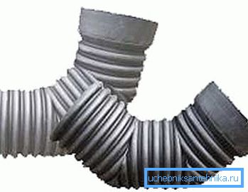 - Curvas de tubo corrugado. Estos elementos están unidos por embragues y provistos de anillos de sellado en cada lado. En el punto de inflexión, la parte exterior del producto tiene un diámetro reducido. Ámbito de aplicación: acoplamiento de tubos de diversos materiales mediante el sellado de los puños.