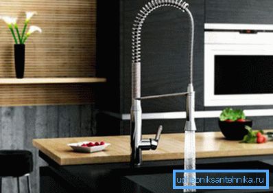 - La regadera se encuentra en un nido separado junto al grifo principal. El resorte especial lo mantiene en la posición más cómoda.. Esta variedad se considera semiprofesional y es adecuada para cocinas públicas o cocinas que sirven a familias numerosas;