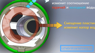Y la proporción de agua caliente y fría se regula girando la placa en una dirección u otra (las placas están unidas al vástago). Tal dispositivo es extremadamente popular, a pesar del hecho de que con el tiempo se vuelve inutilizable, pero el cartucho siempre puede ser reemplazado por uno nuevo y la mezcladora continuará funcionando.