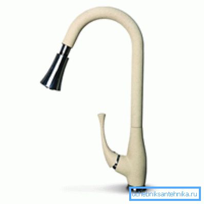 | Con ducha retráctil (un caño). | En el exterior, el grifo de la cocina con ducha extraíble se parece a un grifo común, cuyo pico gira libremente. Sin embargo, si es necesario, se extrae una manguera flexible con una punta de la "punta" dura. Se debe tener en cuenta que hay dos tipos de grifos de cocina con duchas extraíbles: