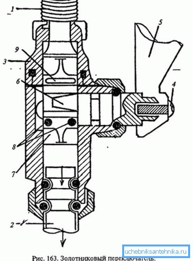 - El interruptor de corcho prácticamente no se utiliza en la actualidad.. Se puede distinguir por un mango largo, que se encuentra en la parte central del dispositivo. El componente principal es un corcho con una muesca. Cuando se realiza la rotación, la cavidad se alinea con las aberturas de entrada y salida.