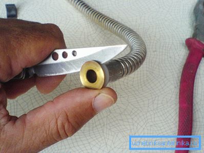 La fuga de la manguera se asocia generalmente con la destrucción de la elasticidad de un tubo de goma que se oculta debajo de la armadura metálica. El tubo es fácil de encontrar en cualquier tienda de plomería; Ella tira de los forros, que luego se presionan en la armadura, mientras fija firmemente el núcleo.