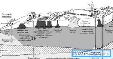 Si dichas fuentes de contaminación están ubicadas en un terreno más alto que su sitio, entonces la probabilidad de que los desechos ingresen a las capas superiores del agua subterránea es extremadamente alta. En tales casos, se recomienda usar un pozo artesiano con el eje más profundo posible del pozo o examinar regularmente el agua desde la capa superior.