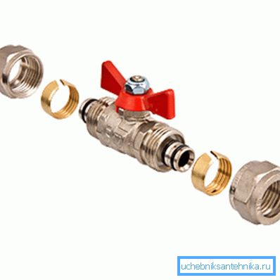 | Collet | Este método de instalación se asemeja a un inserto de armadura en una tubería de metal y plástico, sin embargo, el elemento de sujeción en sí se hace de manera algo diferente. Por lo tanto, antes de conectar la válvula a un tubo de plástico hecho de polietileno, es necesario no solo cortar el último con suavidad, sino también quitar el chaflán de unos pocos milímetros. Además de la tuerca y el anillo de sujeción, antes de instalar el anillo de retención y el anillo de sellado se colocan en el tubo. Además, el dispositivo en sí no tiene un estrangulador. |