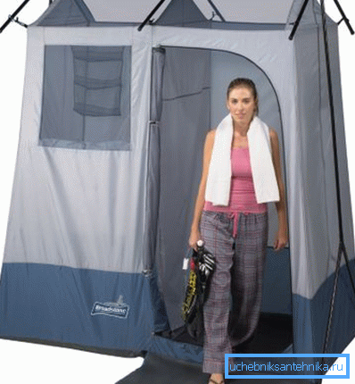 Esto no es una ducha de pleno derecho, pero aún así vale la pena mencionar este diseño por separado. Es un bastidor plegable con material estirado impermeable. En este caso, resuelve el problema de la comodidad y la posibilidad de privacidad.