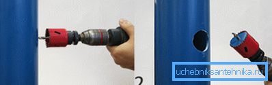 Una vez que hemos hecho el agujero, desconectamos el adaptador en dos partes: simplemente salen una de la otra en las ranuras, como se ve en la foto superior. La pieza que tiene una boquilla con una rosca externa (es evidente que una tuerca está atornillada) es necesaria para el montaje en la tubería.