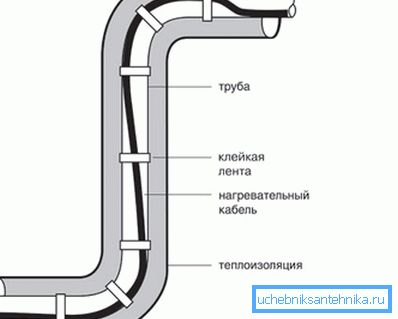 - Además, un cable eléctrico se tira en paralelo con la tubería, es mejor si se trata de un cable calefactor: esto protegerá la línea principal contra las heladas. El cable está unido a la tubería a lo largo de toda la longitud con cinta adhesiva, como se muestra en el diagrama.