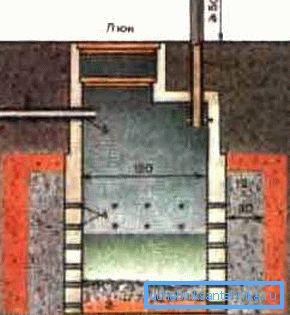 - Excavamos un pozo, cuya condición principal es su profundización por debajo del nivel de congelación del suelo y mantener al menos 100 cm del agua subterránea. Elegimos las dimensiones en función de la cantidad de flujo diario de aguas residuales.