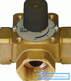 Es imposible no considerar otro tipo de dispositivo: un grifo mezclador de tres vías, también mezcla el flujo de agua, pero se usa en sistemas de calefacción y tiene las siguientes características:
