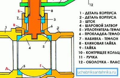 - El bloqueo del flujo de refrigerante se lleva a cabo debido al movimiento de una bola de metal con un agujero coaxialmente con una holgura de tubería. Cuando giras el mango de la grúa en acción, viene la varilla, que gira la esfera dentro del cuerpo, combinando el agujero con la luz de la tubería.
