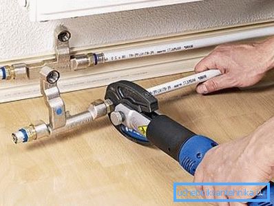 - Para empezar, cortamos un fragmento de la tubería que estaremos tendiendo. Esto se puede hacer con la ayuda de una sierra de plástico normal, pero es mejor usar un cortador de tubos especial.