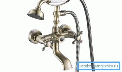 | Dos válvulas | Son una opción clásica que es familiar para todos. Las ventajas incluyen la facilidad de configurar la temperatura deseada, sin embargo, las válvulas de las válvulas fallan rápidamente, lo que hace que se cambien con frecuencia. Por lo tanto, con estos productos, como norma, hay un diagrama que muestra no solo cómo conectar, sino también cómo desmontar el grifo del baño con una ducha. |