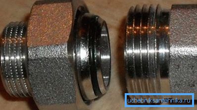 Como ya se mencionó, dicha conexión implica el uso de una tuerca de sombrerete y un anillo de sellado. Tales accesorios se parecen ligeramente al metal-polímero. El método de apego es casi el mismo.