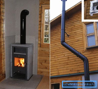 El conducto de humos se guía a través de la pared de un edificio de madera utilizando estructuras especiales de tubos de manivela equipadas con las llamadas "puertas" utilizadas como elementos para ajustar el empuje en la tubería. Para fijar la chimenea a la pared, se utilizan soportes de metal, montados a intervalos regulares que no excedan 1 metro de longitud.