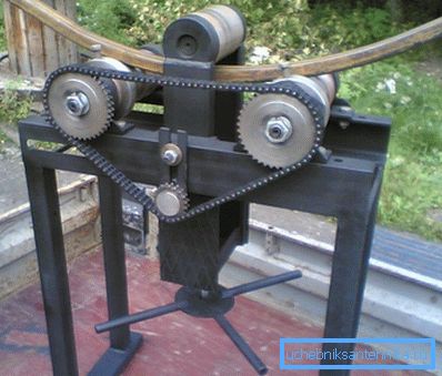 El diseño de este dispositivo es bastante simple: 2 paradas y zapata, accionadas por una palanca. Con la ayuda de este simple dispositivo, puede doblar una tubería con un diámetro de 5 a 150 mm.