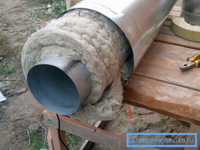- El montaje es muy simple: se toma una pieza del tubo interior, que se envuelve cuidadosamente con lana de roca. El trabajo se realiza gradualmente: la parte envuelta en el aislamiento se inserta en la sección del tubo exterior por sección. Es importante ensamblar los elementos con el sellado más alto posible del aislante térmico.