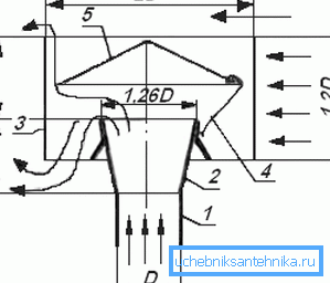 - Difusor. Es un trozo de tubo en forma de cono truncado, que se lleva por un lado estrecho en el tubo. Aumenta la presión en la tubería en la punta, por lo tanto, aumenta la diferencia de presión y la actividad de expulsión de aire de escape por el viento fluye;